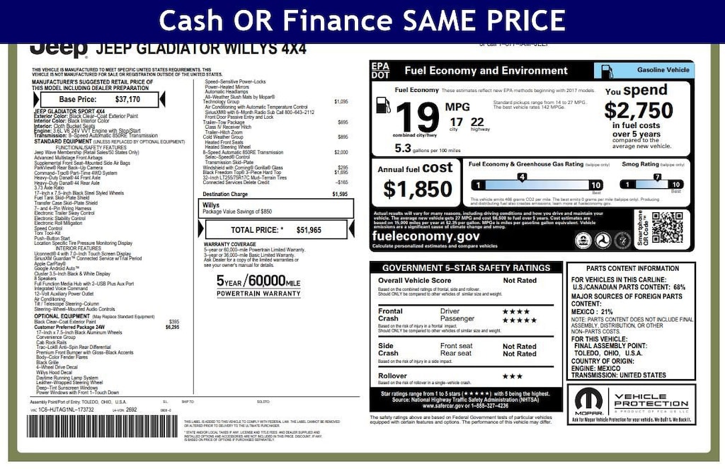 QUICK ORDER PACKAGE 24W WILLYS Engine: 3.6L V6 24V VVT UPG I w/ESS, Transmission: 8-Speed Automatic (850RE), Convenience Group, Universal Garage Door Opener, Speed Sensitive Power Locks, Protection Sill Rails, Leather Wrapped Steering Wheel, 4-Wheel Drive Decal, Black Grille, Body Color Fender Flares (2-Piece), Front 1-Touch Down Power Windows, Front Heavy Duty Red Accent Shock Absorbers, Security Alarm, Willys, Mold In Color Bumper w/Gloss Black, Automatic Headlamps, Willys Hood Decal, Rear Heavy Duty Red Accent Shock Absorbers, 97 MPH Vehicle Max Speed Calibration, Power Heated Mirrors, Daytime Running Lamp System, Power Tailgate Lock, Bridgestone Brand Tires, Remote Keyless Entry, Sun Visors w/Illuminated Vanity Mirrors, TRANSMISSION: 8-SPEED AUTOMATIC (850RE) Transmission Skid Plate, Selec-Speed Control, BLACK 3-PIECE HARD TOP Freedom Panel Storage Bag, Rear Window Defroster, Rear Sliding Window, TECHNOLOGY GROUP Air Conditioning w/Auto Temp Control, 2-Door Passive Entry, Front Door Locks, SiriusXM Satellite Radio, SiriusXM Radio Service, Cluster 7.0" TFT Color Display, For More Info, Call 800-643-2112, COLD WEATHER GROUP Heated Steering Wheel, Heated Front Seats, TRAILER TOW PACKAGE Trailer Hitch Zoom, Class IV Receiver Hitch, Heavy Duty Engine Cooling, 240 Amp Alternator, ENGINE: 3.6L V6 24V VVT UPG I W/ESS (STD).