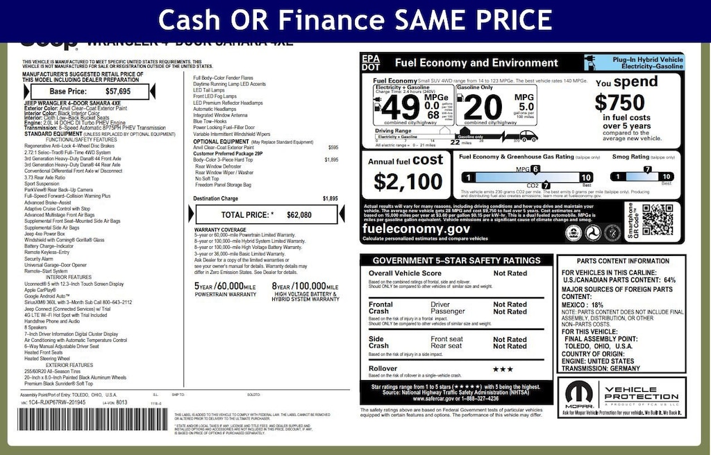 BODY COLOR 3-PIECE HARD TOP Freedom Panel Storage Bag, Rear Window Defroster, Rear Window Wiper/Washer, No Soft Top, ENGINE: 2.0L I4 DOHC DI TURBO PHEV (STD), TRANSMISSION: 8-SPEED AUTO 8P75PH PHEV (STD). Jeep Sahara with Anvil Clear Coat exterior and Black interior features a 4 Cylinder Engine with 375 HP at 5250 RPM*.